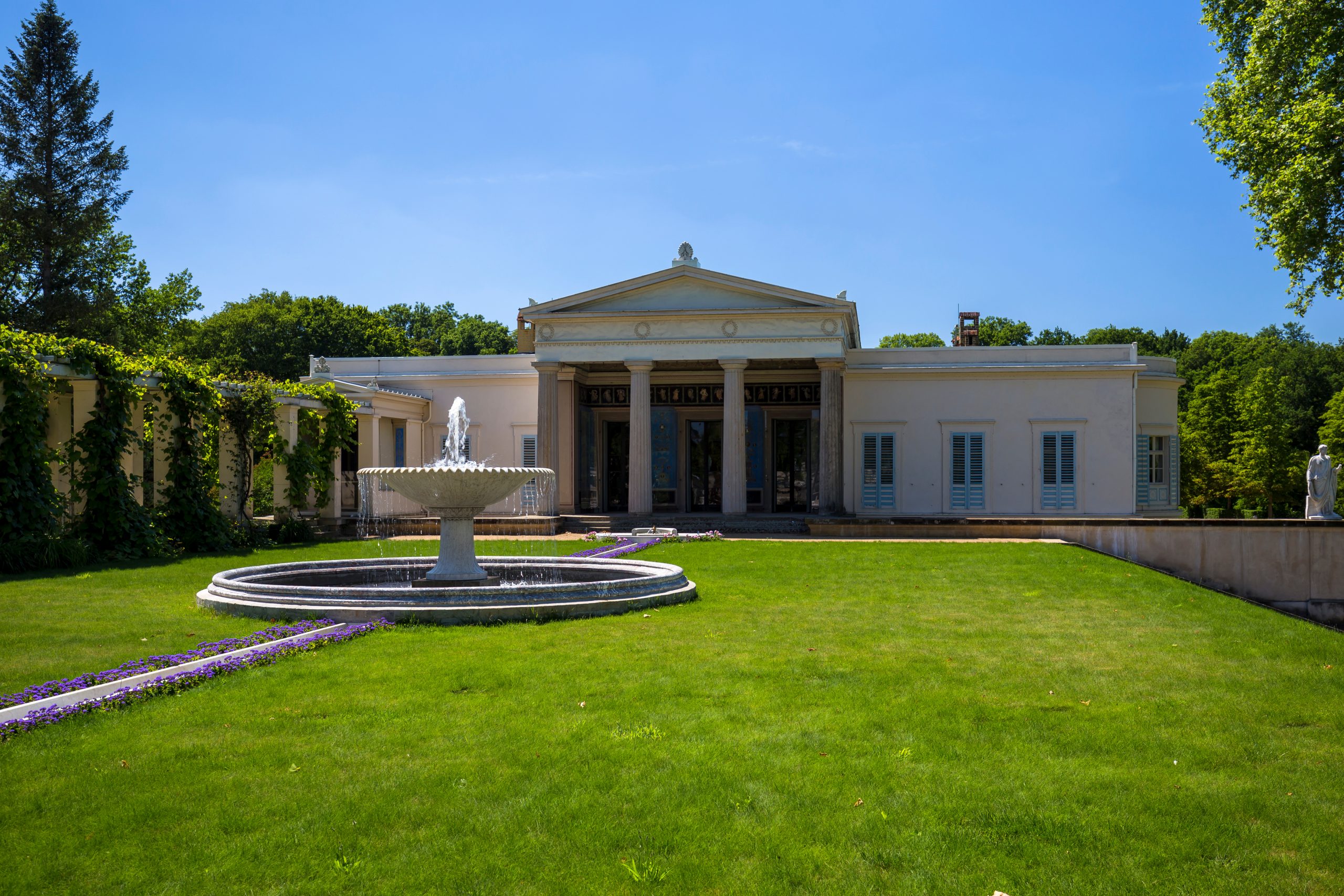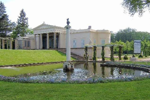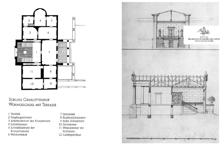 Verschiedene Elemente verstärken die Verbindung von Innen- und Außenraum. Pergolen, eine Terrasse und die Exedra erweitern das Gebäude nach draußen. Schloss und Park Charlottenhof gelten als das Herzstück des preußischen Arkadiens.